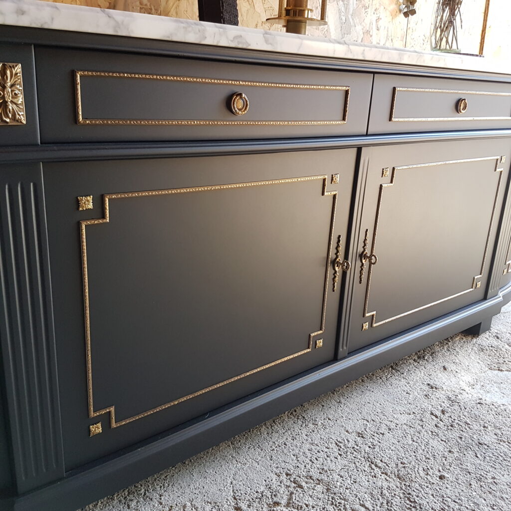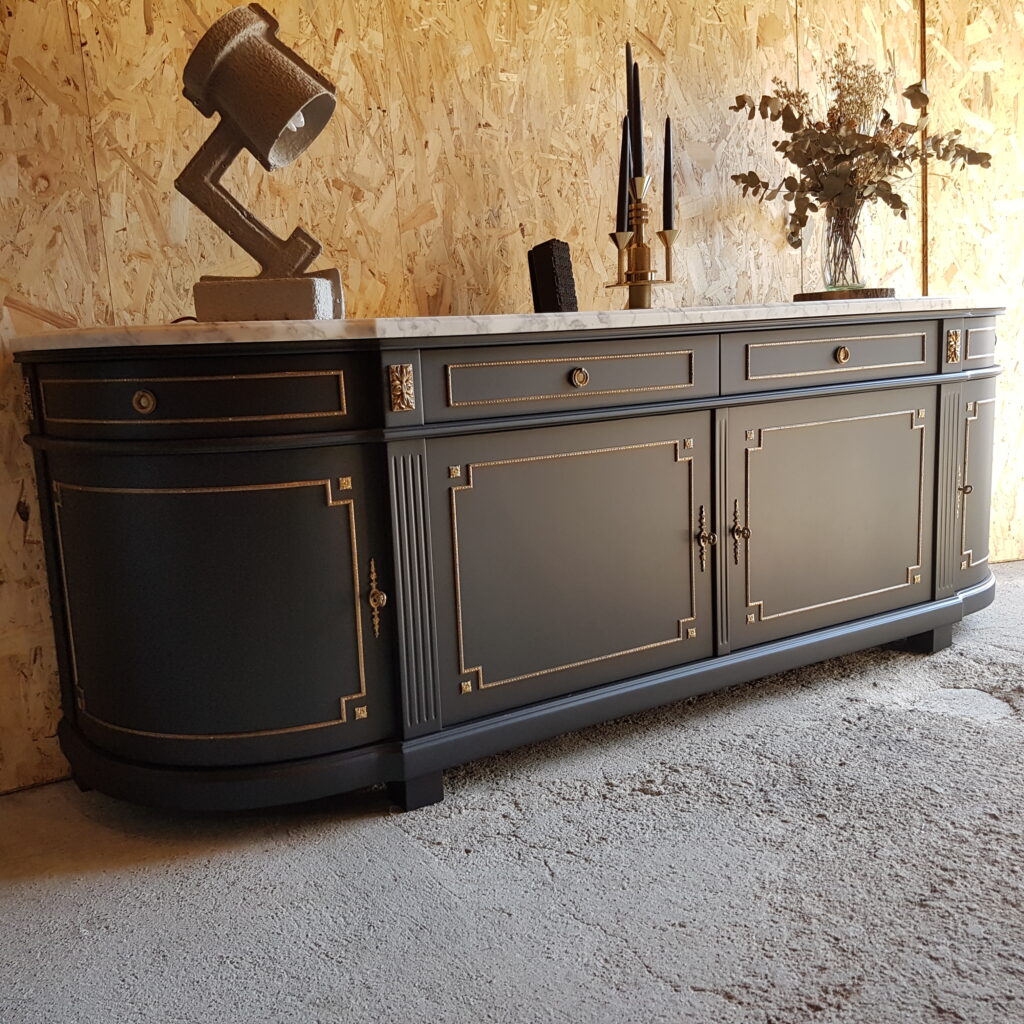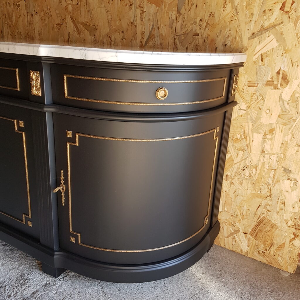 Enfilade de style Louis XVI ouvrant par 4 portes dont 2 arrondies surmontées sur chacune d’un tiroir. Un plateau de marbre de type Carrare vient coiffer ce meuble.