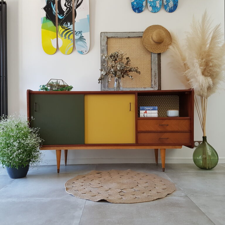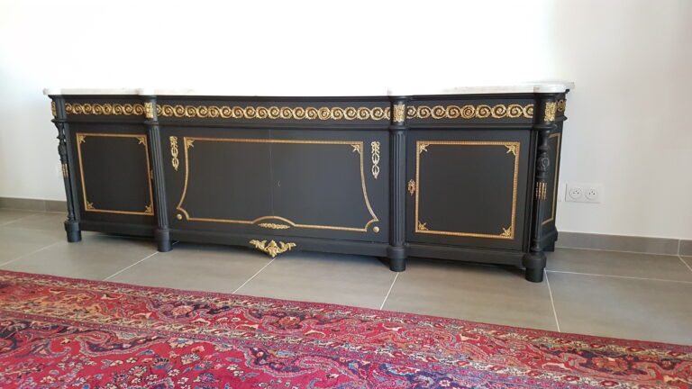 Enfilade de style Louis XVI ouvrant par 4 portes dont 2 arrondies surmontées sur chacune d’un tiroir. Un plateau de marbre de type Carrare vient coiffer ce meuble.