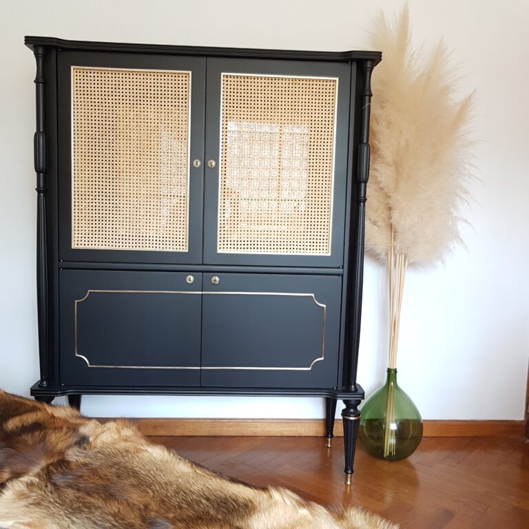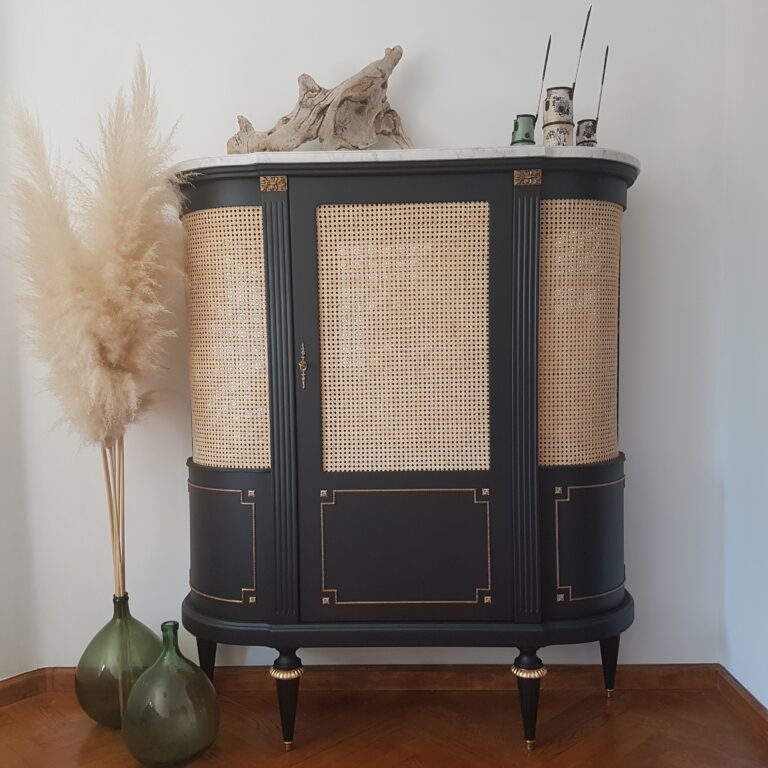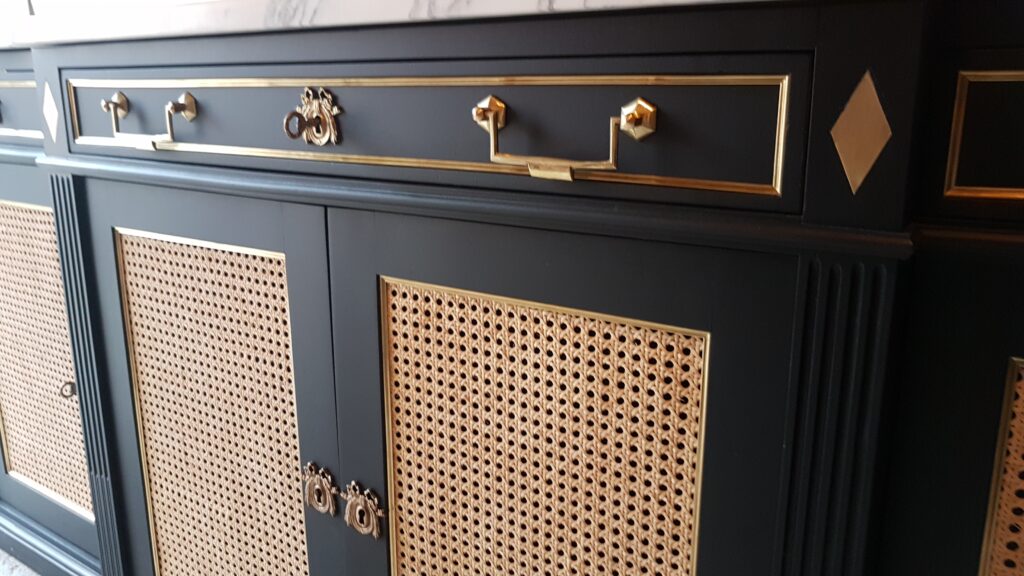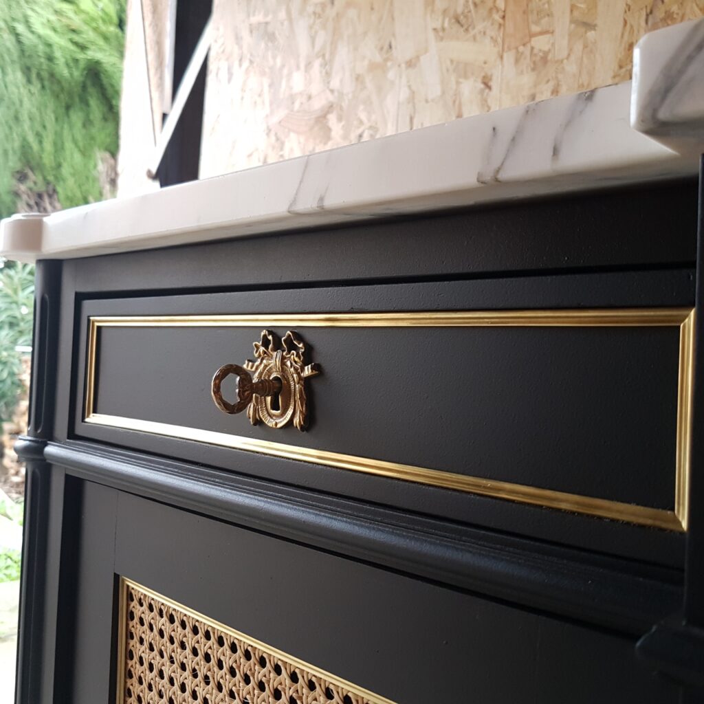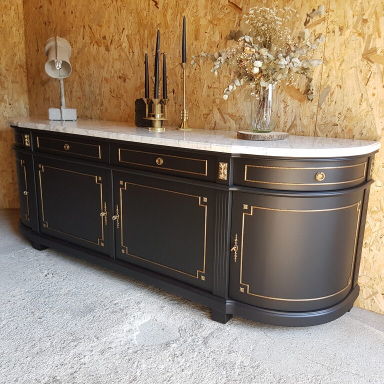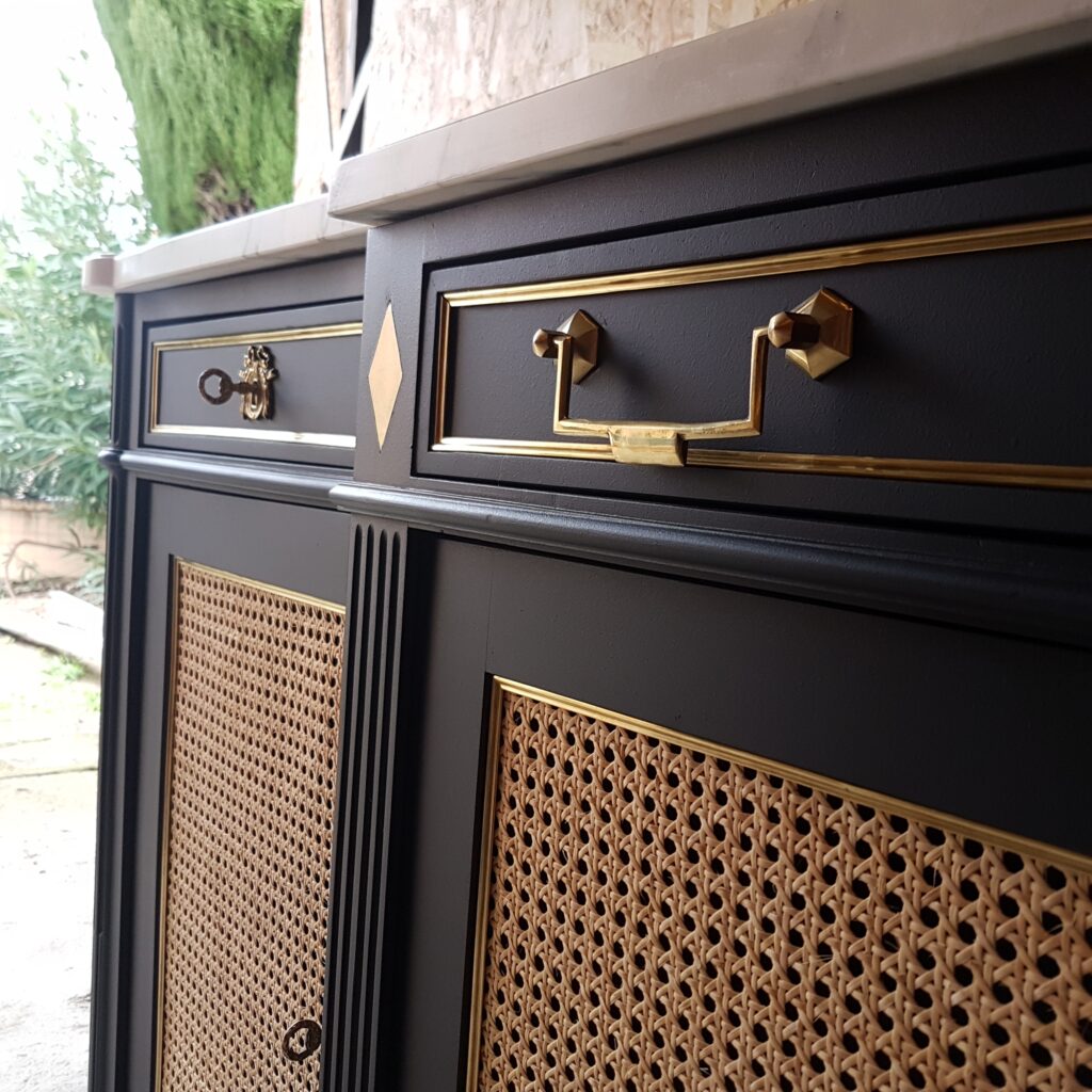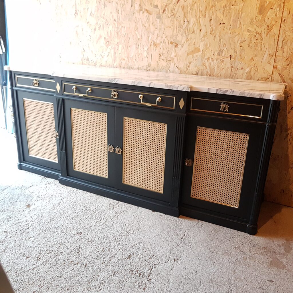 Enfilade de style Louis XVI cannée Enfilade style Louis XVI d'époque 1900 en noyer massif, peint… Enfilade style Louis XVI d’époque 1900 en noyer massif, peint en noir mat, elle ouvre par 4 portes surmontées par 3 tiroirs. Elle possède un très beau marbre veiné blanc d’origine. Share