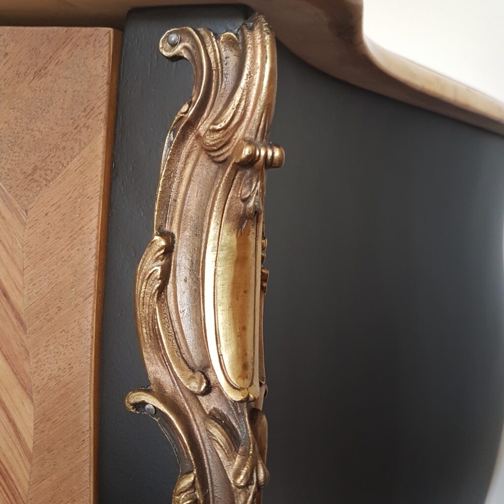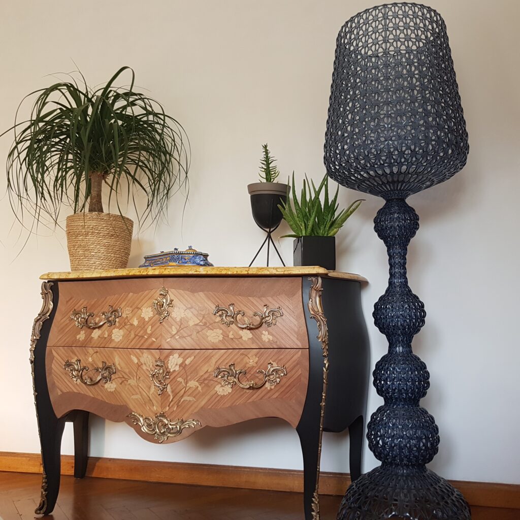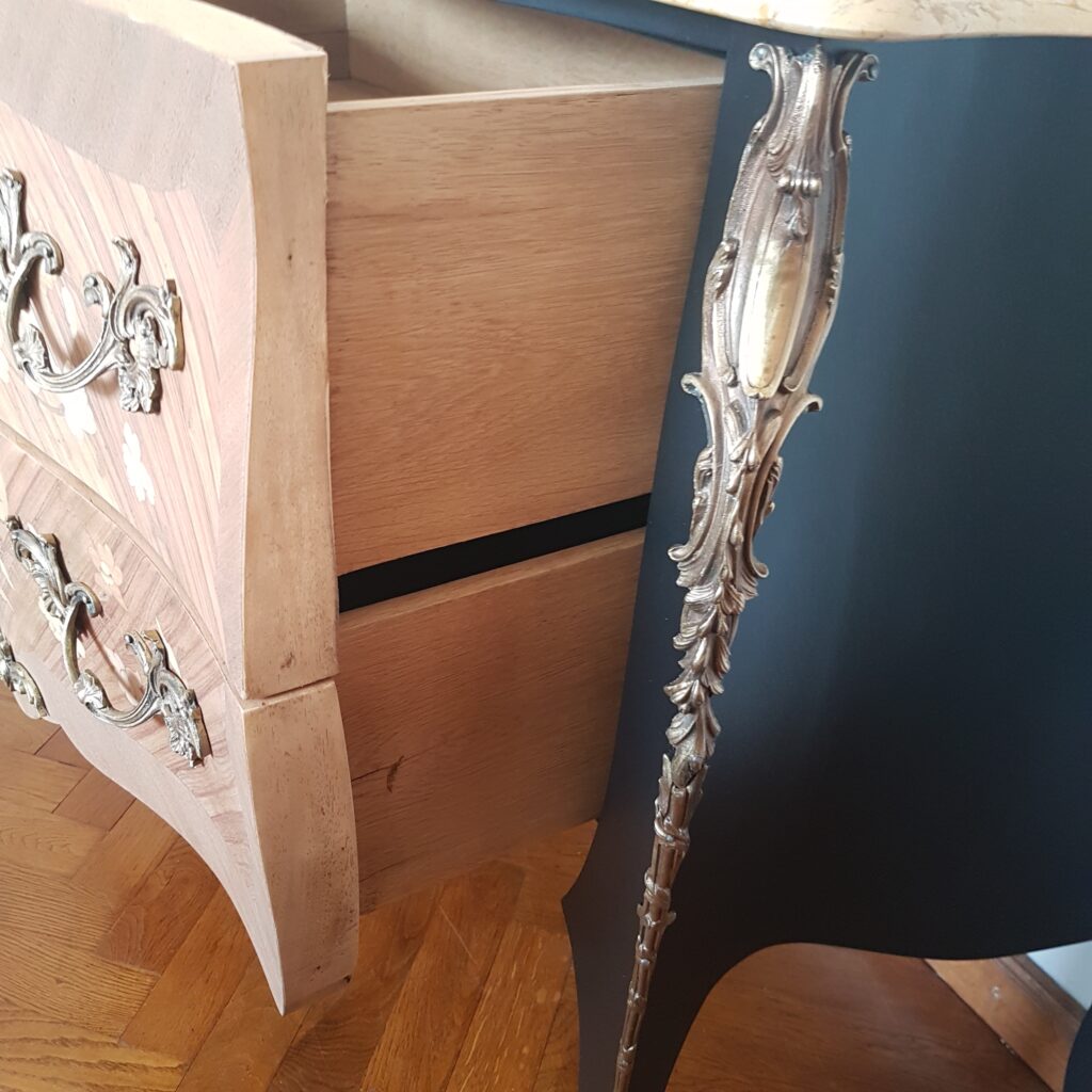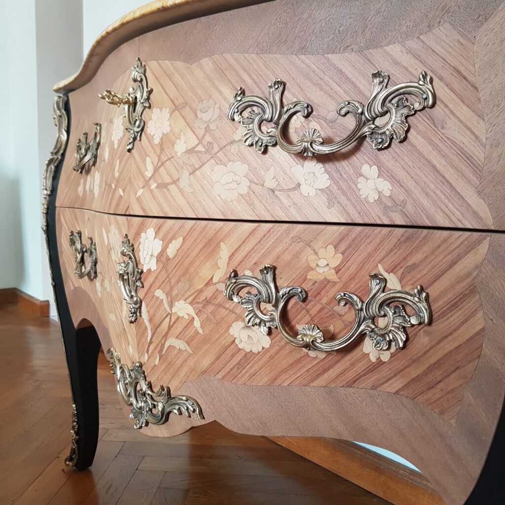 Commode de style Louis XV Black&Wood Commode galbée de style Louis XV, elle comporte deux larges… Commode galbée de style Louis XV, elle comporte deux larges tiroirs à décors de marqueterie florale en façade. Share