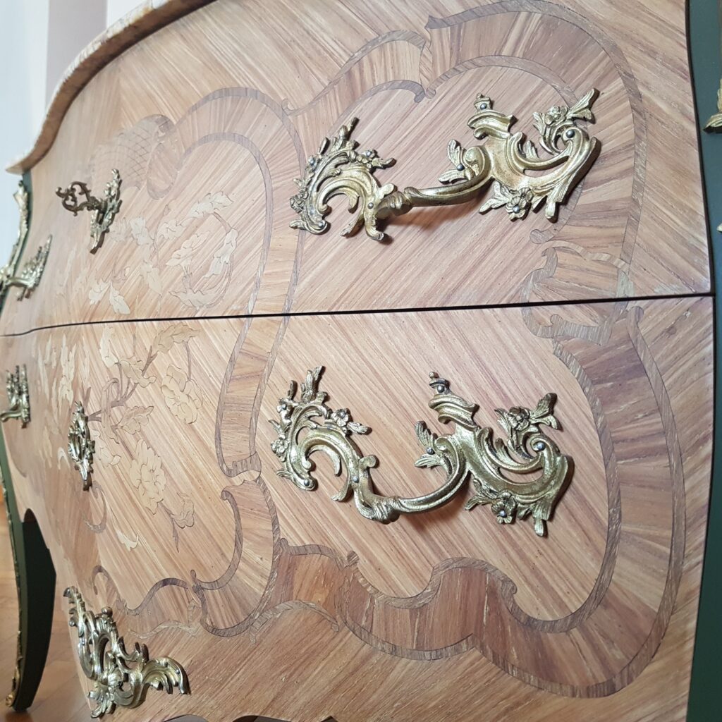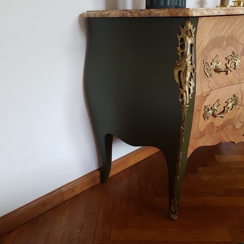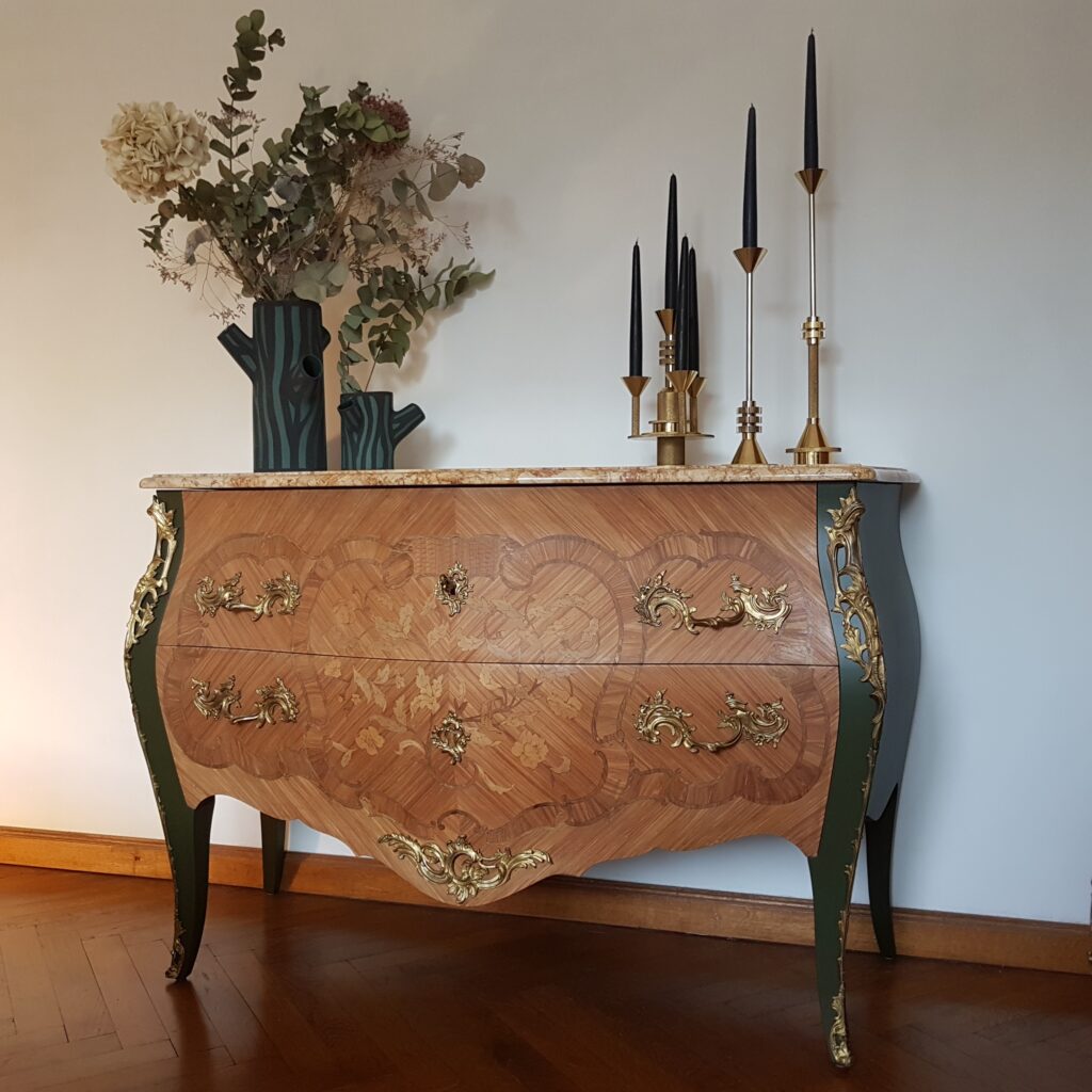 Commode de style Louis XV kaki&wood Commode de style Louis XV ouvrant par deux larges tiroirs… Commode de style Louis XV ouvrant par deux larges tiroirs marquetés, l’ossature a été traitée en kaki mat, un plateau de marbre. vient coiffer le meuble. Share