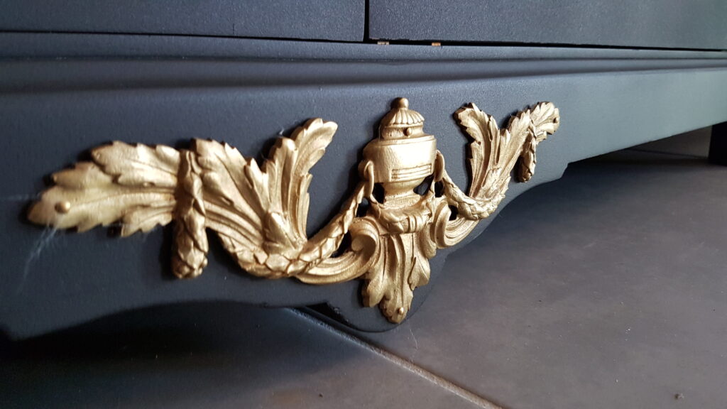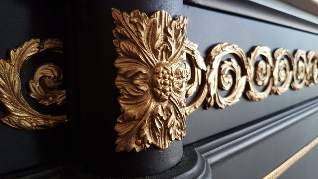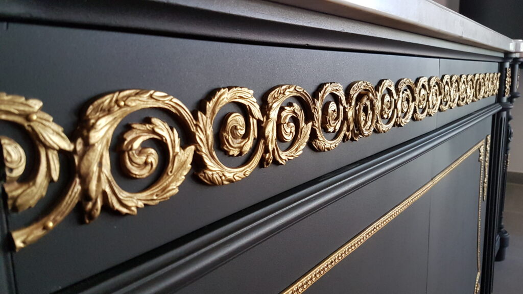Enfilade de style Louis XV ouvrant par deux portes en partie centrale et d’une porte de chaque côté, surmontée chacune d’un tiroir. Une très belle décoration d’enroulements de feuilles d’acanthe en bronze court le long des tiroirs. Un marbre blanc de type Carrare vient coiffer ce meuble.