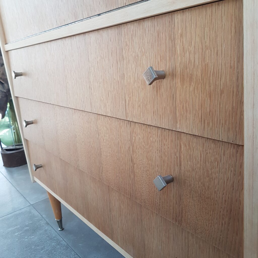Secrétaire vintage en placage de chêne clair comportant trois tiroirs…