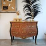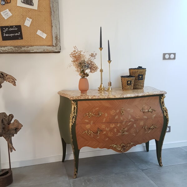 Commode galbée de style Louis XV d’époque XX, elle comporte deux tiroirs. Ce meuble de belle facture est en bois massif, et est décoré en façade dans un médaillon d’une marqueterie florale composée de bois de violette, érable teinté et au naturel ainsi que de bois exotiques.