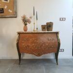 Commode galbée de style Louis XV d’époque XX, elle comporte deux tiroirs, fermant avec une seule clef. Ce meuble de belle facture est en bois massif, et est décoré en façade d’une marqueterie florale composée de bois de rose, érable teinté et au naturel ainsi que de bois exotiques.