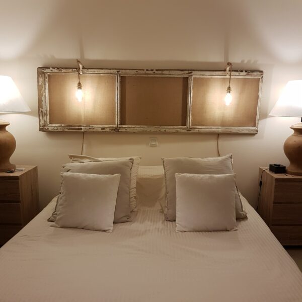 Tête de lit composée d’une ancienne fenêtre ainsi que de toile de jute.